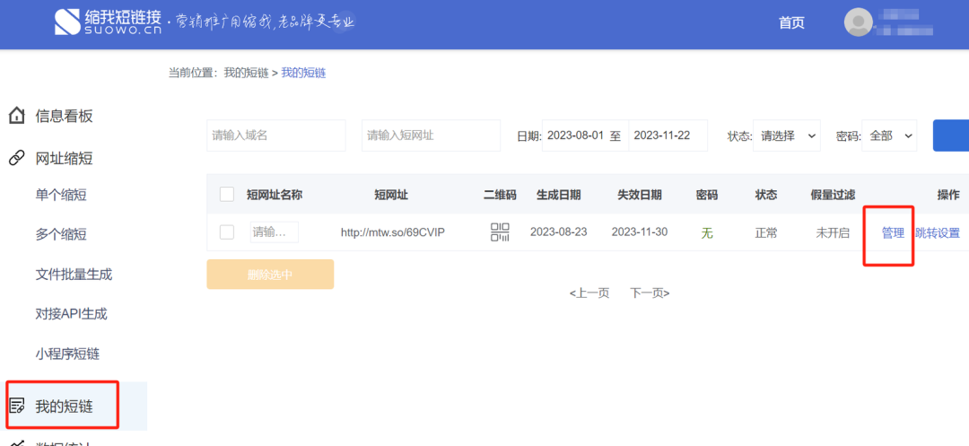 如果想让链接的有效期更加精确,可以具体到某天、某小时甚至某秒,可以在生成短链接时先随便选一个有效期,然后到【我的短链】,点击该短链右侧的【管理】按钮,进行修改。