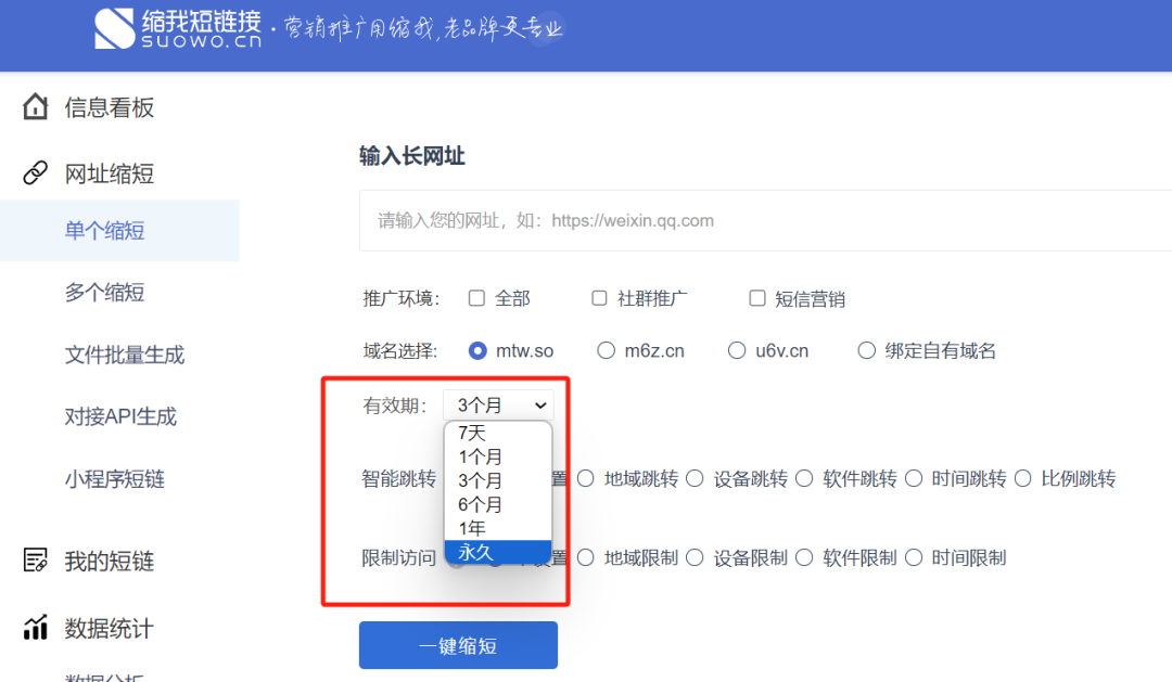 在生成短链接的时候,手动选择有效期,可以选择7天、1个月、3个月、6个月、1年以及永久有效,如果不选,则默认有效期3个月。