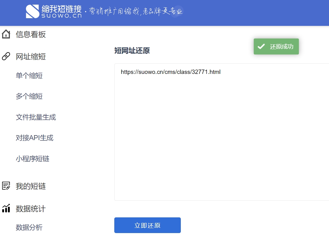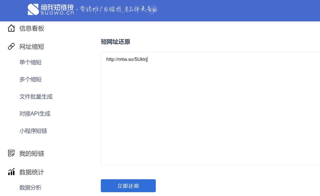 打开缩我短链接亚博网站首页官网,右上角点击登录进入后台,到左侧工具栏找到【短链接还原】,粘贴或输入需要还原的短链接(如下图)。