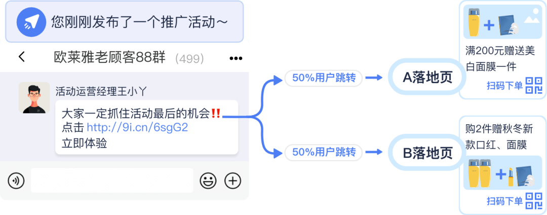 做什么:为同一个落地页创建两个不同的短链接(a和b),分别搭配不同的文案或图片进行推广。
